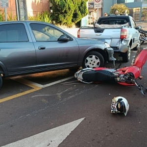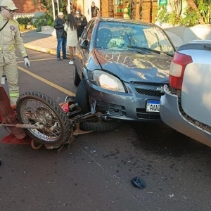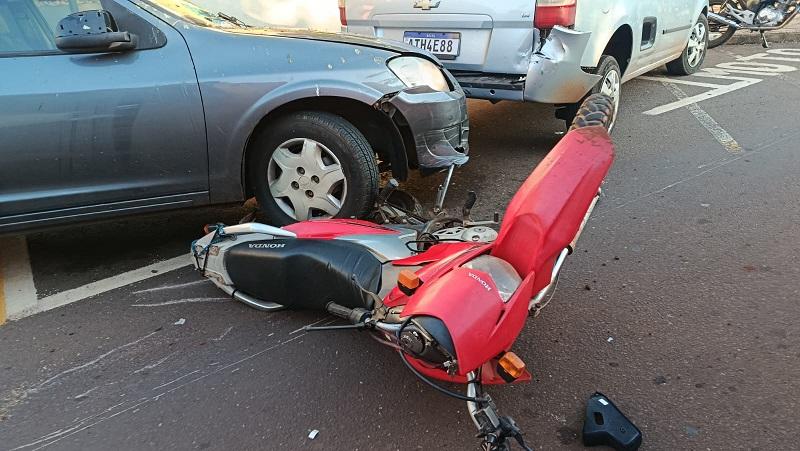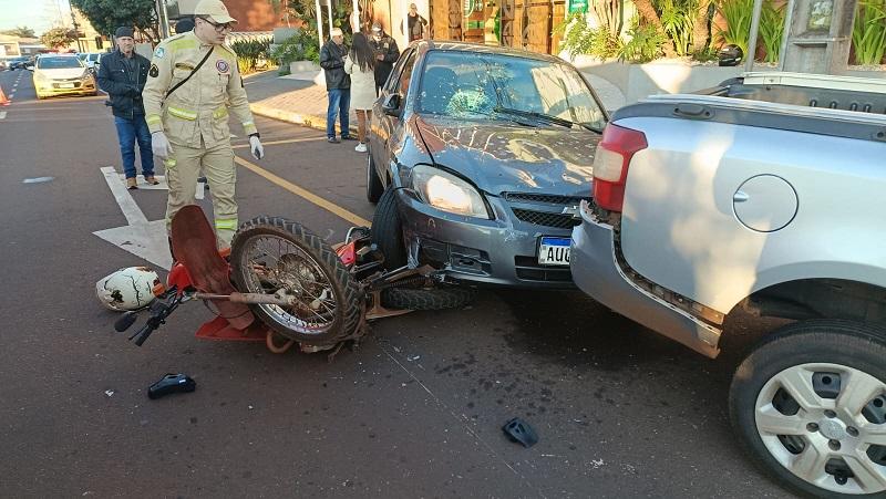 Um acidente envolvendo dois automóveis e uma motocicleta foi registrado por volta das 7h40 da manhã desta quinta-feira (3) na Rua Sarandi, região central de Toledo. A colisão resultou em uma mulher ferida e mobilizou equipes do Corpo de Bombeiros e da Polícia Militar.