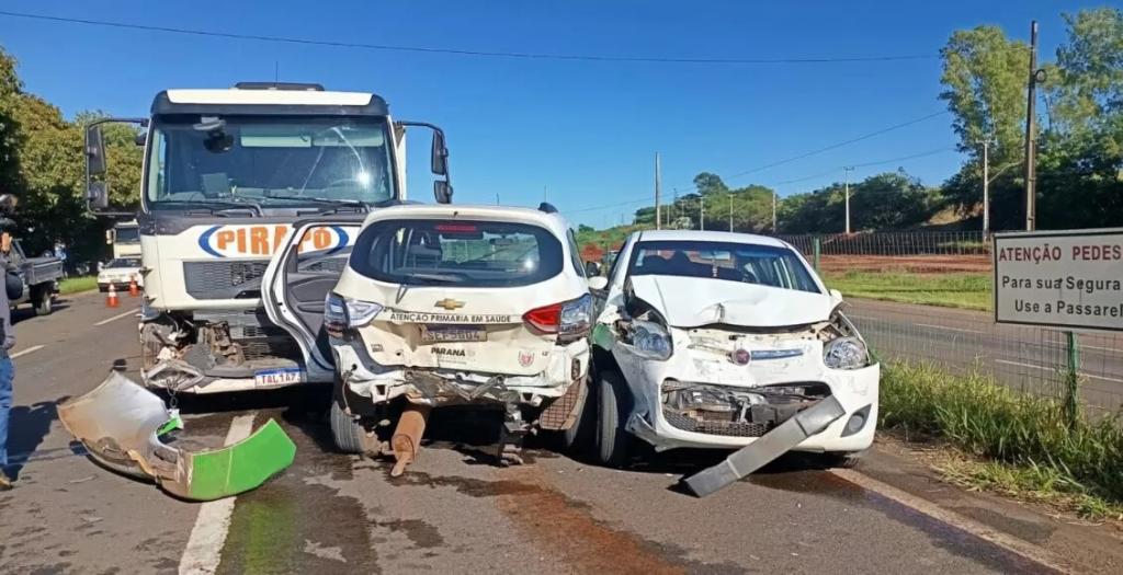 Com o impacto, o trânsito na rodovia federal ficou parcialmente interrompido, provocando lentidão e formação de congestionamento no sentido Mandaguaçu–Maringá. Em razão do fluxo travado, um caminhão que seguia pela via acabou colidindo com veículos que estavam parados, dando início a um engavetamento envolvendo seis veículos — sendo um caminhão, uma motocicleta, um veículo da Secretaria de Saúde de Nova Esperança e outros três carros de passeio.
