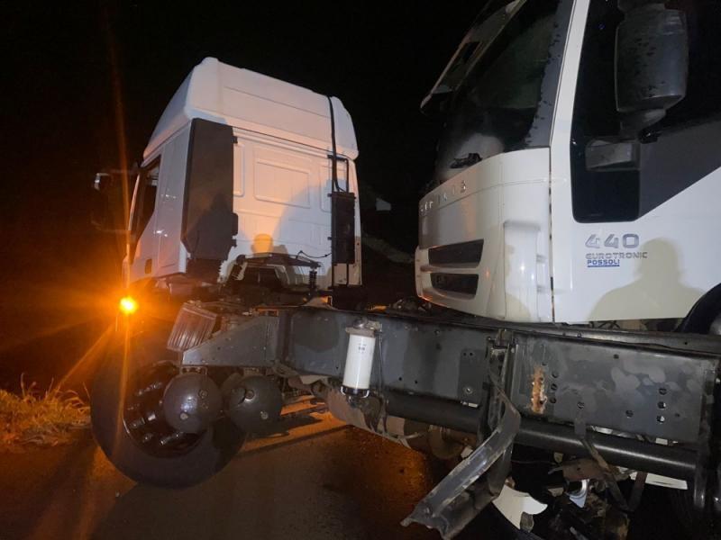 Com o impacto, o caminhão ficou com o chassi retorcido. Apesar dos danos, ninguém se feriu.