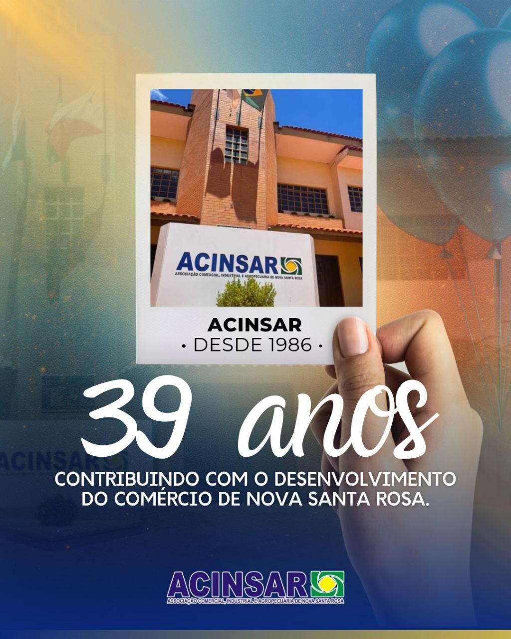 A Associação Comercial, Industrial e Agropecuária de Nova Santa Rosa (ACINSAR) comemora nesta quarta-feira (19) seus 39 anos de história. Ao longo de quase quatro décadas, a entidade construiu uma trajetória marcada pelo trabalho conjunto, pela união entre empresários e pelo fortalecimento do comércio e da economia local.