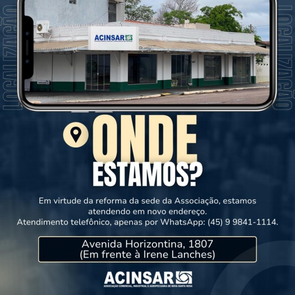 Enquanto a reforma acontece, a ACINSAR já está atendendo em um espaço provisório, no prédio onde funcionava a antiga Cicles Motos, na Avenida Horizontina, 1807. Para entrar em contato com a Associação, o atendimento é exclusivamente pelo celular/WhatsApp no número (45) 9 9841-1114.