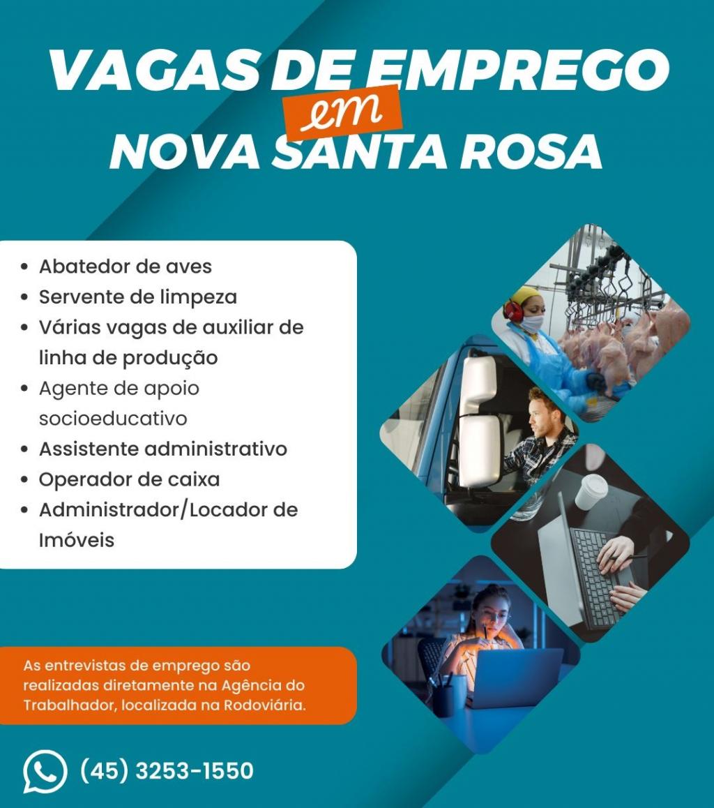 Entre as vagas disponíveis, há oportunidades para abatedor de aves, servente de limpeza, auxiliar de linha de produção, agente de apoio socioeducativo, assistente administrativo, operador de caixa e administrador/locador de imóveis.
