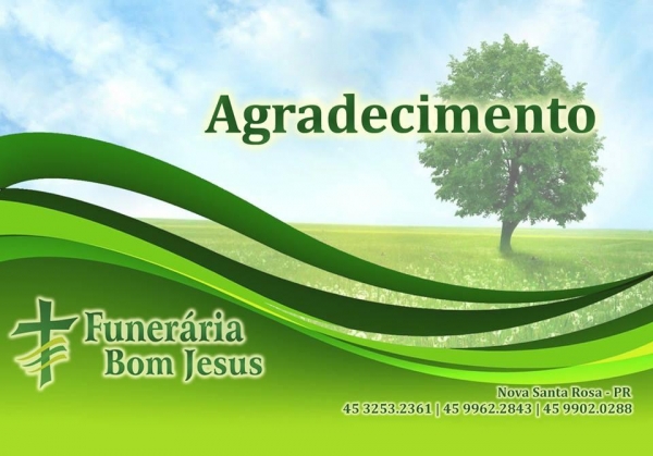Dora König e filhos ainda consternados com o falecimento de seu ente querido Ervino König, vem agradecer aos pastores: Renato Hein, Jandir Gund, Claudio Siewert, Neldo Rohde. Presbíteros: Edegar König e Helio Zimmermann, pelas inúmeras visitas, orações e palavras direcionadas ao sempre lembrado ente querido Ervino König. A igreja de Linha Arapongas, a pessoa de Arlindo König juntamente com o coral, pelos louvores entoados, as pessoas: Daniel e Nair Lima, Úrsula, Vizinha Janice, Harold Fiedler e Bertoldo Beuter por não medirem esforços. Em especial: hospital CEONC de Cascavel, Doutor Juarez e Gilberto, equipe de enfermagem do centro de saúde, motoristas da ambulância de Nova Santa Rosa, à Funerária Bom Jesus de Nova Santa Rosa pelo funeral prestado. Equipe de trabalho do Cemitério de Vila Nova, agradecem também a todos vizinhos, parentes e amigos, pelo apoio recebido nos momentos de dor, pelas visitas, orações, por cada palavra e abraço durante a enfermidade, enfim a todos que se fizerem presentes no culto fúnebre que Deus recompense a cada um.