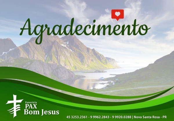 A Família Bär de Planalto D’Oeste ainda consternada com o falecimento do esposo, pai, sogro e avô Sr. Arlindo Edgar Bär, vem agradecer ao Pastor Jonas Schultz, ao Pastor Adelar Borth e a toda Comunidade, ao Sr. Vilmar pelo socorro prestado, ao Hospital Lar Belém pelos primeiros socorros, ao Hospital Marechal, ao Hospital Policlínica de Cascavel, aos doadores de sangue, ao Sr. Noedi e esposa Marli por todos os auxílios prestados, à Funerária Bom Jesus e a todos os familiares, amigos e vizinhos que ajudaram durante os dias de internamento e também por todas as orações e palavras de conforto, à todos o nosso muito obrigado.