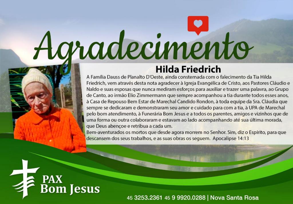 A Família Dauss de Planalto D’Oeste, ainda consternada com o falecimento da Tia Hilda Friedrich, vem através desta nota agradecer à Igreja Evangélica de Cristo, aos Pastores Cláudio e Naldo e suas esposas que nunca mediram esforços para auxiliar e trazer uma palavra, ao Grupo de Canto, ao irmão Elio Zimmermann que sempre acompanhou a tia durante todos esses anos, à Casa de Repouso Bem Estar de Marechal Candido Rondon, à toda equipe da Sra. Cláudia que sempre se dedicaram e demonstraram seu amor e cuidado para com a tia, à UPA de Marechal pelo bom atendimento, à Funerária Bom Jesus e a todos os parentes, amigos e vizinhos que de uma forma ou outra colaboraram e estavam ao lado acompanhando até sua última morada, que Deus abençoe e retribua a cada um.
