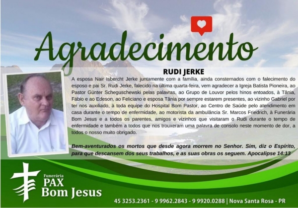 A esposa Nair Isbercht Jerke juntamente com a família, ainda consternados com o falecimento do esposo e pai Sr. Rudi Jerke, falecido na ultima quarta-feira, vem agradecer a Igreja Batista Pioneira, ao Pastor Günter Scheguschewski pelas palavras, ao Grupo de Louvor pelos hinos entoados, à Tânia, Fábio e ao Edeson, ao Feliciano e esposa Tânia por sempre estarem presentes, ao vizinho Gabriel por ter nos auxiliado, à toda equipe do Hospital Bom Pastor, ao Centro de Saúde pelo atendimento em casa durante o tempo de enfermidade, ao motorista da ambulância Sr. Marcos Friedrich, à Funerária Bom Jesus e a todos os parentes, amigos e vizinhos que visitaram o Rudi durante o tempo de enfermidade e também a todos que nos trouxeram uma palavra de consolo neste momento de dor, a todos o nosso muito obrigado.