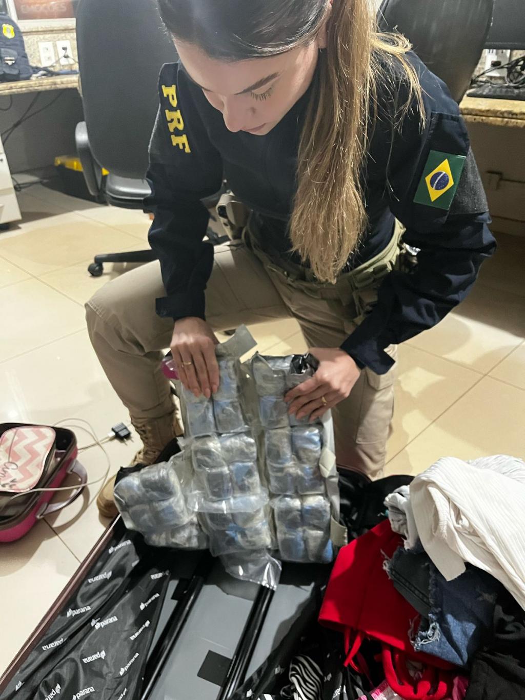 A PRF apreendeu aproximadamente 11 quilos de haxixe na madrugada desta sexta-feira (21), durante fiscalização no quilômetro 714 da BR-277, em Foz do Iguaçu. A droga estava escondida em fundos falsos de malas transportadas por duas passageiras em um Nissan V-Drive, abordado pelos policiais.