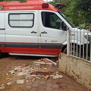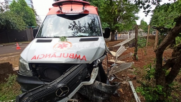 Após a colisão a ambulância desgovernada invadiu a calçada e atingiu o muro de uma residência parando parcialmente dentro do terreno.