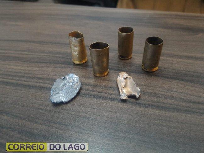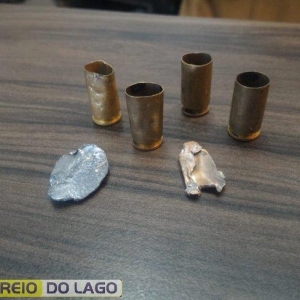 Do lado externo do apartamento, constatou mais um tiro na floreira pouco abaixo da janela e mais quatro disparos na grade em frente. A equipe efetuou buscas no local e localizou quatro estojos deflagrados de calibre 9mm (sendo dois da marca pmc, um da marca águila e um da marca fc), que estavam na rua.