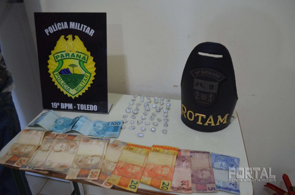 Em busca pessoal em um rapaz, foi localizado uma pedra de crack em seu bolso direito na parte da frente e no seu bolso de trás fora localizado dinheiro, o qual não sabia precisar a quantia e procedência, que após contado totalizou R$ 507,00, ainda foi encontrado dois celulares o qual o rapaz disse que o Samsung teria sido adquirido de um desconhecido e moto G não soube explicar a procedência.