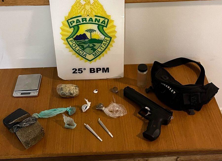 Na noite de ontem (02), a Polícia Militar de Umuarama, no noroeste do Paraná, apreendeu um adolescente de 16 anos acusado de tráfico de drogas e posse de simulacro de arma de fogo. A ação ocorreu após denúncias anônimas informarem que o menor estaria armado e realizando comércio de entorpecentes em um colégio, utilizando um veículo Gol para armazenar e distribuir as drogas.