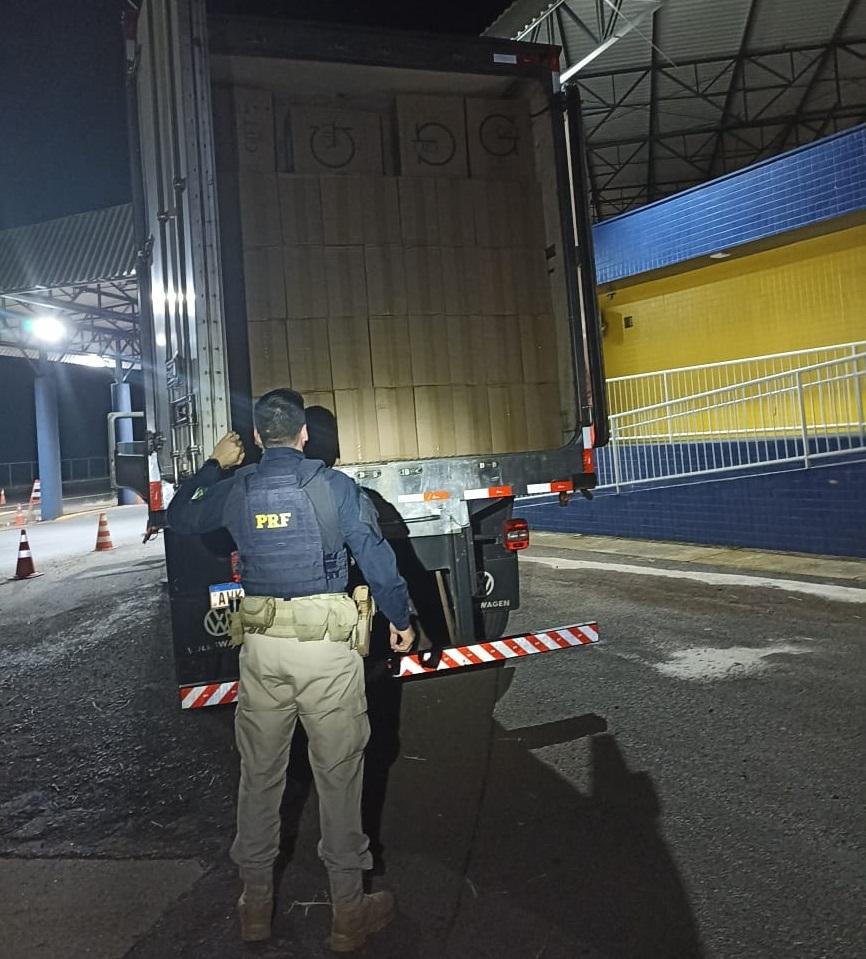 Após os policiais constatarem a carga ilícita de 350.000 maços de cigarros, o condutor alegou que pegou o veículo já carregado na cidade de Dourados-MS e que levaria até Santa Catarina.