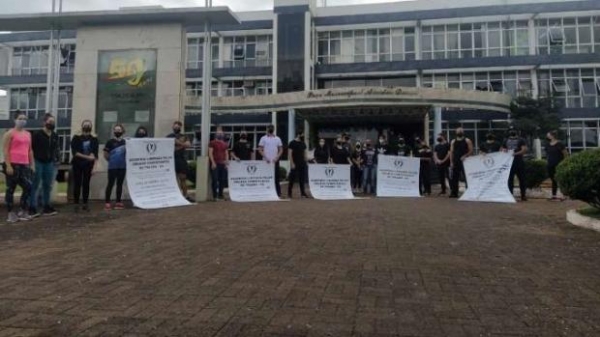 Vestidos de preto e com cartazes em mãos, os profissionais foram à prefeitura de Toledo no início da tarde desta terça-feira a fim de chamar a atenção das lideranças municipais para a pauta das academias.