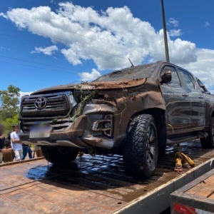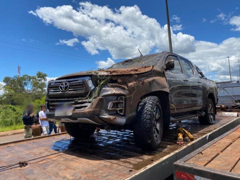 A PRF segue no local e guinchos trabalham para remoção da Hilux do banhado.