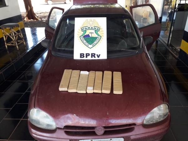 Após abordagem do veículo foi constatado em seu interior 07 tabletes de maconha que após ser pesada totalizou 5,200Kg.