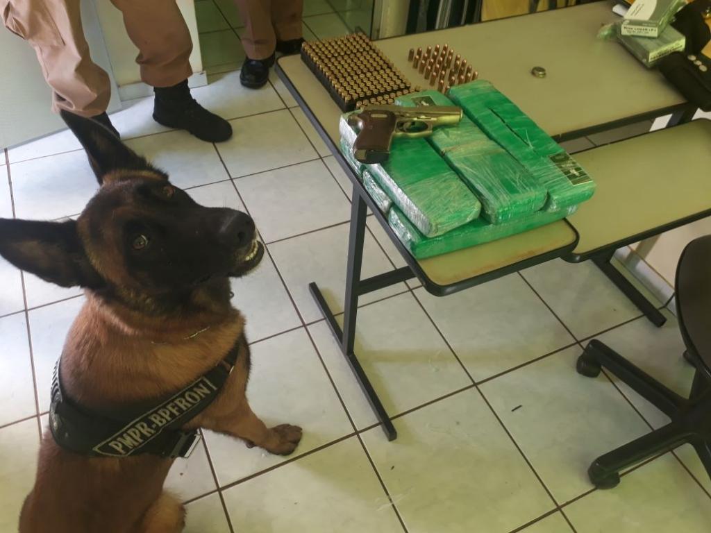 Foram localizados na bagagem indicada 4,286 kg de maconha, 200 munições calibre 9 mm, 34 munições calibre .380 além de uma pistola calibre 9 mm.