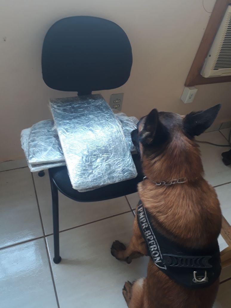 Ao realizar revista veicular o cão policial do Pelotão Operações com Cães indicou a presença de entorpecente em uma bagagem.
