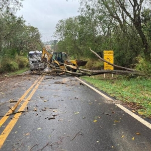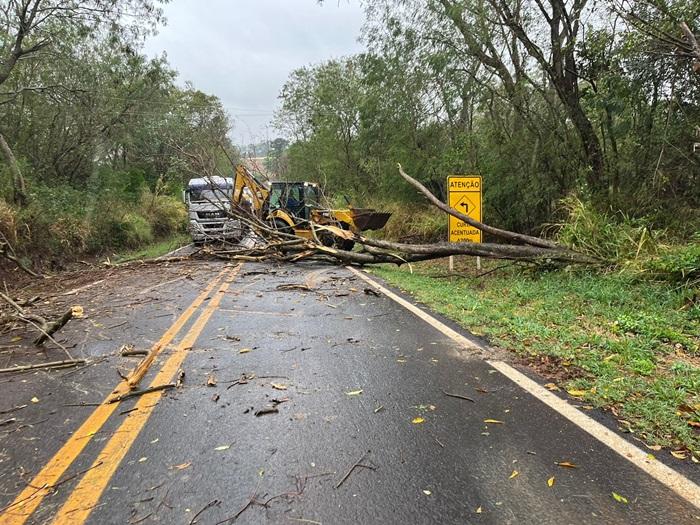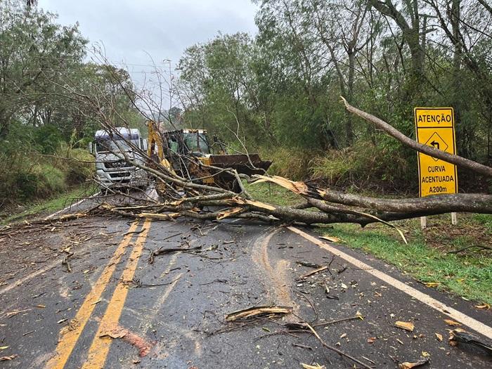 Uma enorme árvore caiu, provavelmente com a força dos ventos na manhã deste sábado em Nova Santa Rosa, na rodovia PR 491 que liga a cidade ao município de Maripá, proximidades do Frigorífico Frigorosa.