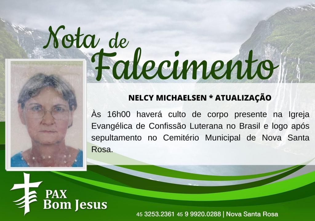 O Plano Pax Bom Jesus, juntamente com os filhos Marcio e Marcelo Fucks, de Nova Santa Rosa, com pesar comunicam o falecimento da mãe, sogra e avó Sra. Nelcy Michaelnsen, ocorrido hoje aos 76 anos de idade.