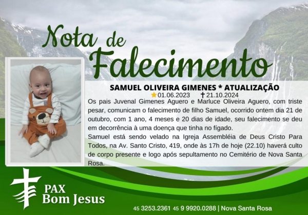Os pais Juvenal Gimenes Aguero e Marluce Oliveira Aguero, com triste pesar, comunicam o falecimento de filho Samuel, ocorrido ontem dia 21 de outubro, com 1 ano, 4 meses e 20 dias de idade, seu falecimento se deu em decorrência à uma doença que tinha no fígado.