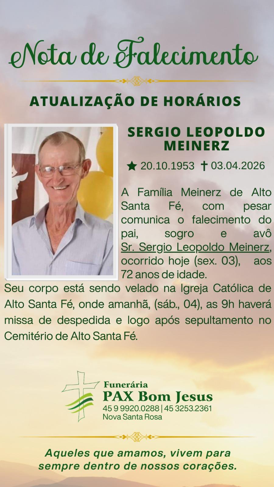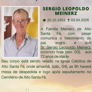 A Família Meinerz de Alto Santa Fé, com pesar comunica o falecimento do pai, sogro e avô Sr. Sergio Leopoldo Meinerz, ocorrido hoje (03), aos 72 anos de idade.