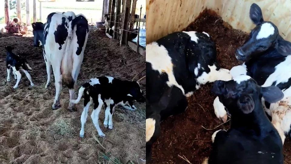 A vaca leiteira se chama Vânia e deu à luz três bebês, um macho e duas fêmeas.