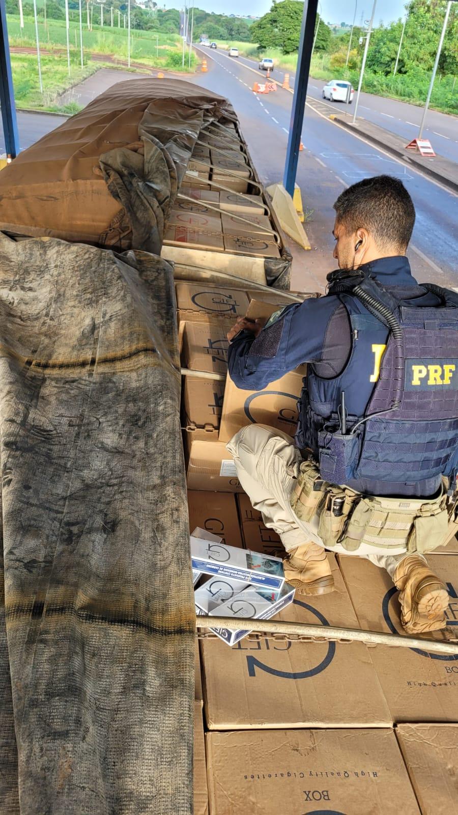 A carreta transportava 750 mil maços de cigarros quando foi interceptada pelos policiais rodoviários federais na BR-163.