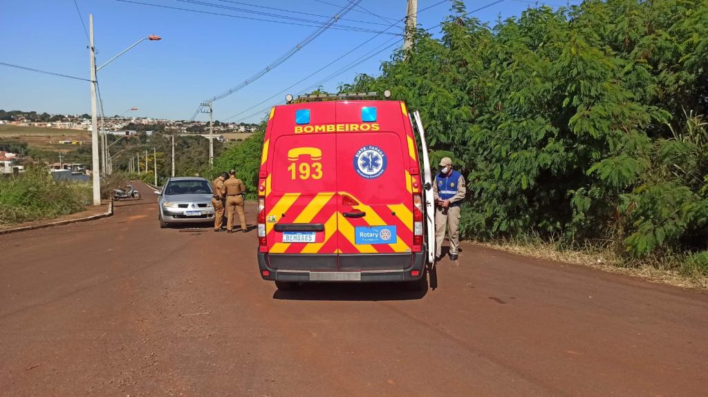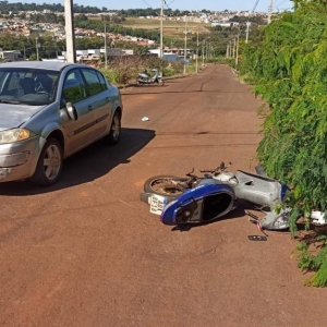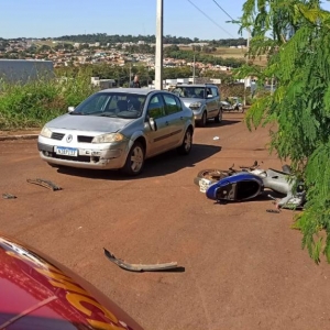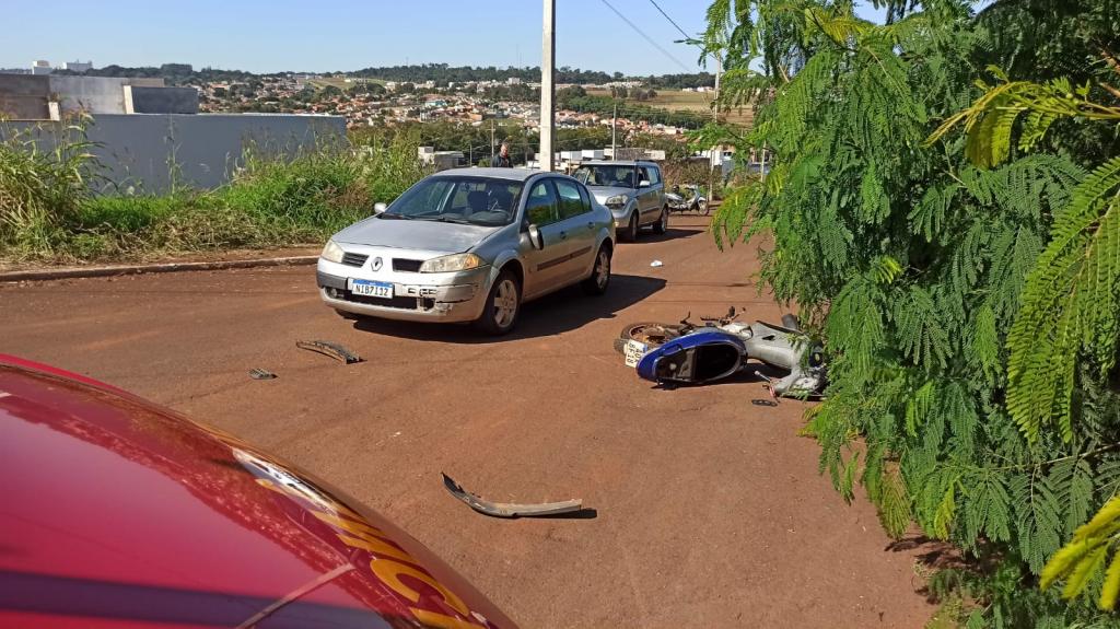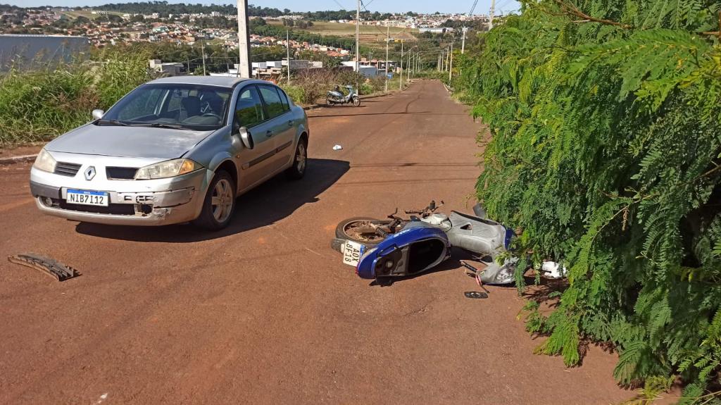 Um acidente entre um carro e uma moto foi registrado por volta do meio-dia desta terça-feira na rua Pastor Uwes cruzamento com rua Quintinho Berticelli no bairro Jardim Pancera em Toledo.