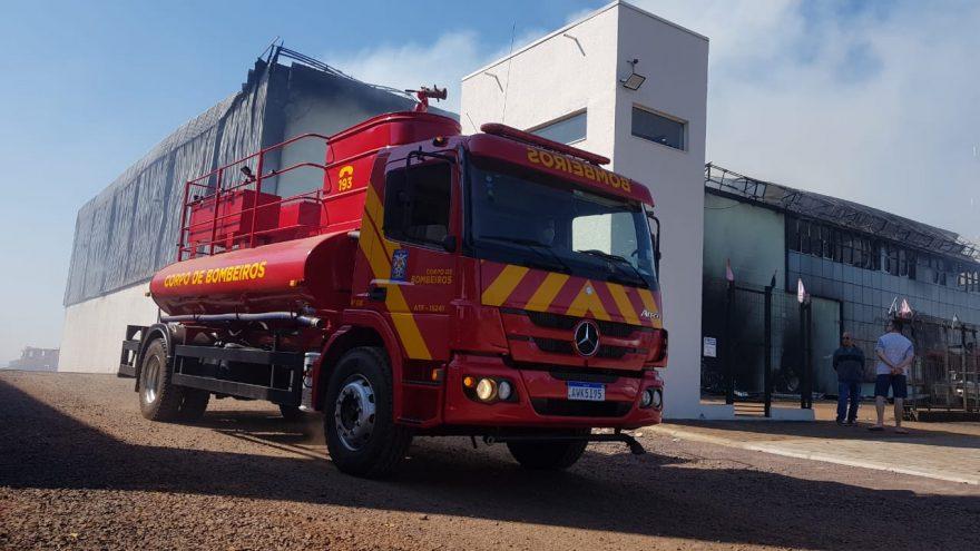 As equipes do Corpo de Bombeiros de Cascavel continuam os trabalhos para combater o incêndio em empresa, localizada às margens da BR 277, na saída para Foz do Iguaçu.