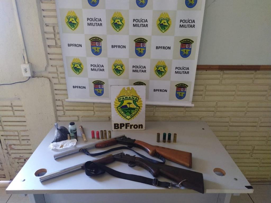 Foi dado voz de abordagem ao veículo e localizado em seu interior duas armas de fogo artesanais, sendo uma calibre 12 e a outra calibre 16, bem como 5 munições calibre 12 intactas e 4 munições calibre 16 intactas, 2 cartuchos calibre 16 deflagrados bem como um recipiente contendo pólvora, uma sacola contendo chumbo para recarga e 10 espoletas para recarga.