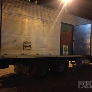 Ao abrir o furgão do caminhão foi constatado que estava completamente carregado de caixas de cigarros (aproximadamente 600 caixas).