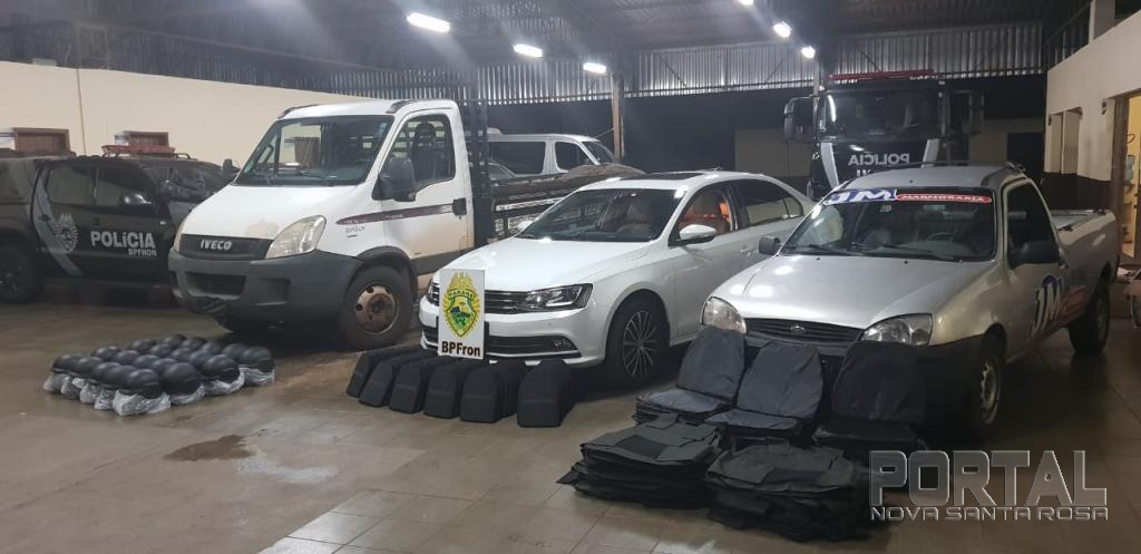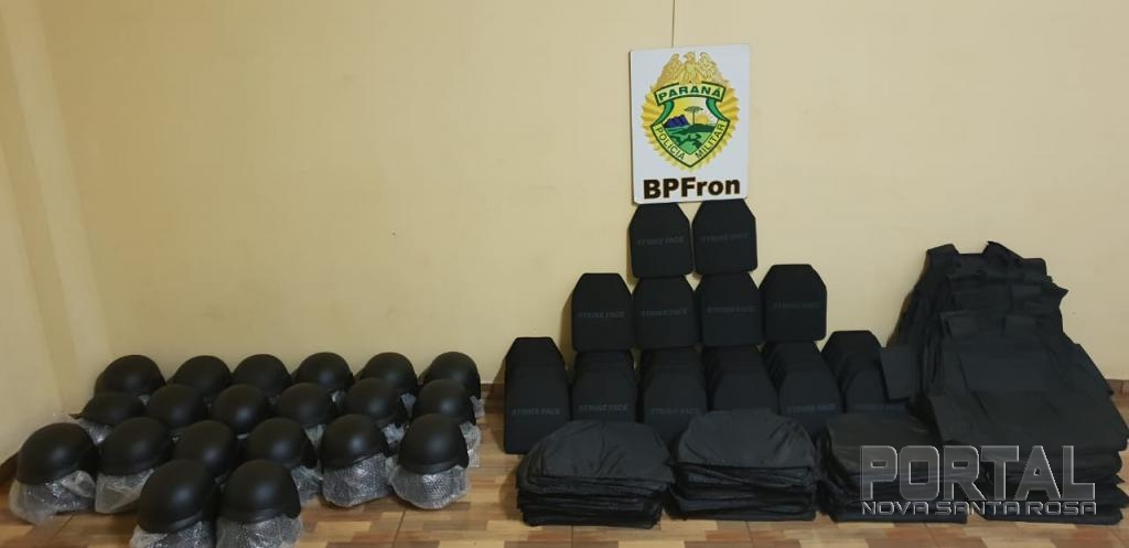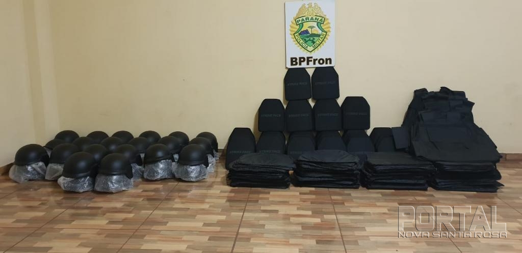 Ao ser feito a contagem do material bélico apreendido, chegou-se ao seguinte somatório: 40 capas para colete balístico, 80 coletes balísticos, 80 placas balísticas e 40 capacetes balísticos (sendo estes equipamentos bélicos, de acordo com o r-105), divididos em 13 caixas de papelão distribuídas da seguinte forma: 02 (duas) caixas dentro do veículo volkswagen jetta, 03 (três) caixas dentro do veículo ford courier, 04 (quatro) caixas na carroceria do iveco mássimo e 04 (quatro) caixas espalhadas pelo pátio.