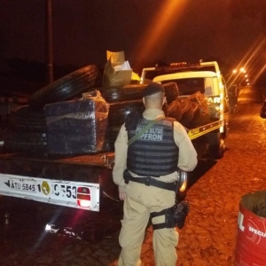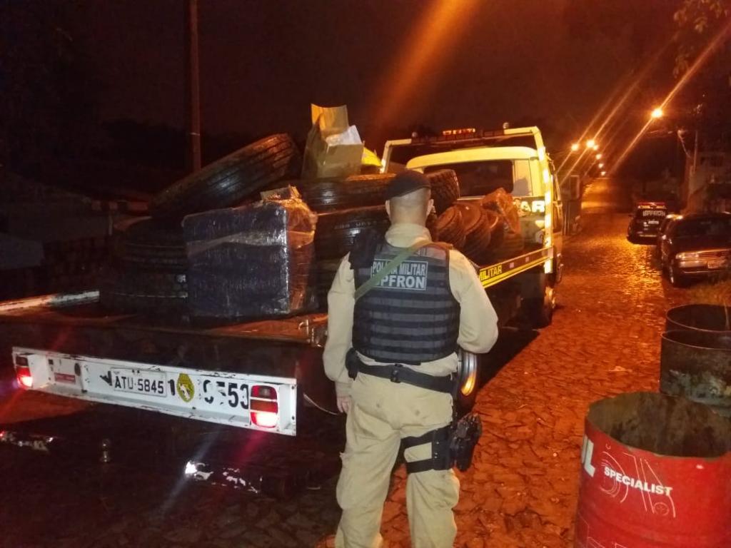 No depósito foram encontrados 16 pneus contrabandeados do Paraguai além de aproximadamente 100 kg de substância análoga a veneno agrícola. O contrabando apreendido foi encaminhado aos procedimentos legais cabíveis. Na noite de ontem também na cidade de Foz do Iguaçu - PR outra ocorrência do gênero foi registrada. Policiais Militares do BPFron realizavam patrulhamento quando adentraram em um porto clandestino. Indivíduos visualizaram a presença policial e se evadiram, não sendo localizados. No local, quatro pneus de caminhão contrabandeados do Paraguai foram apreendidos e encaminhados à Receita Federal de Foz do Iguaçu - PR para procedimentos.