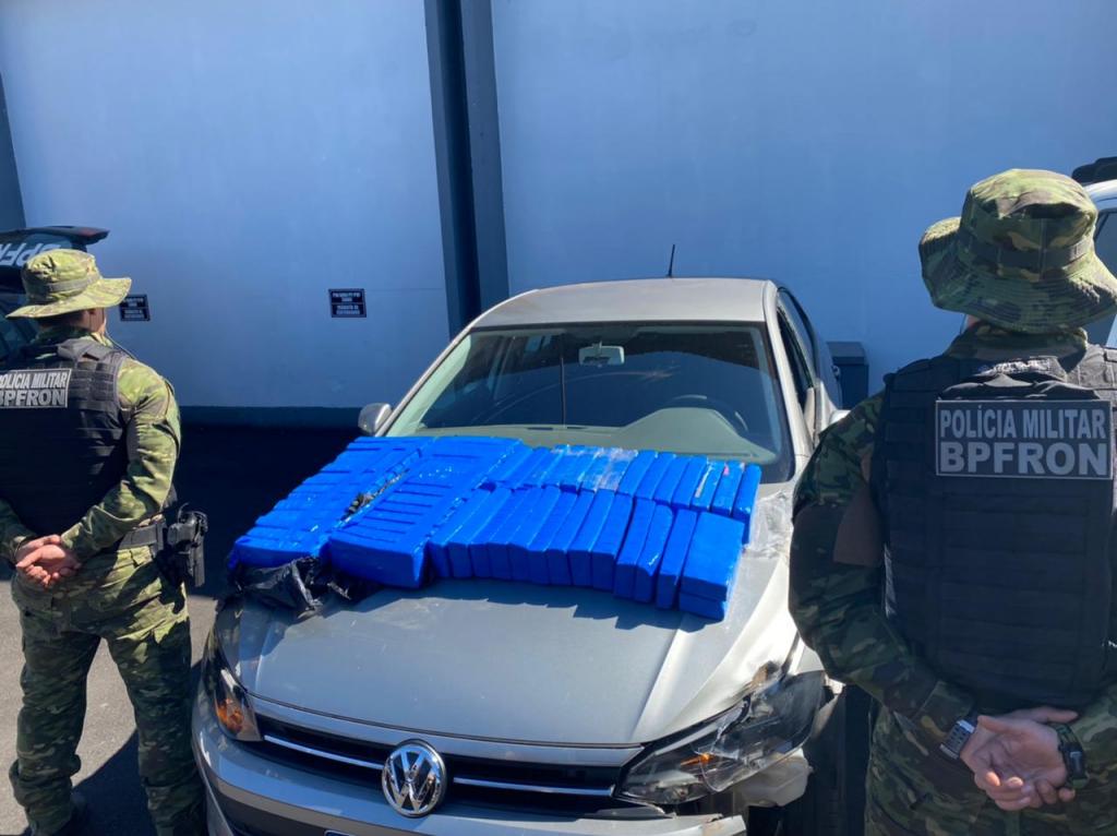 No carro foram encontrados tabletes de substância análoga a maconha totalizando 55,800 kg.