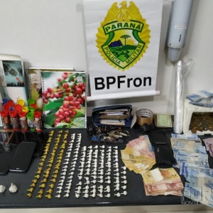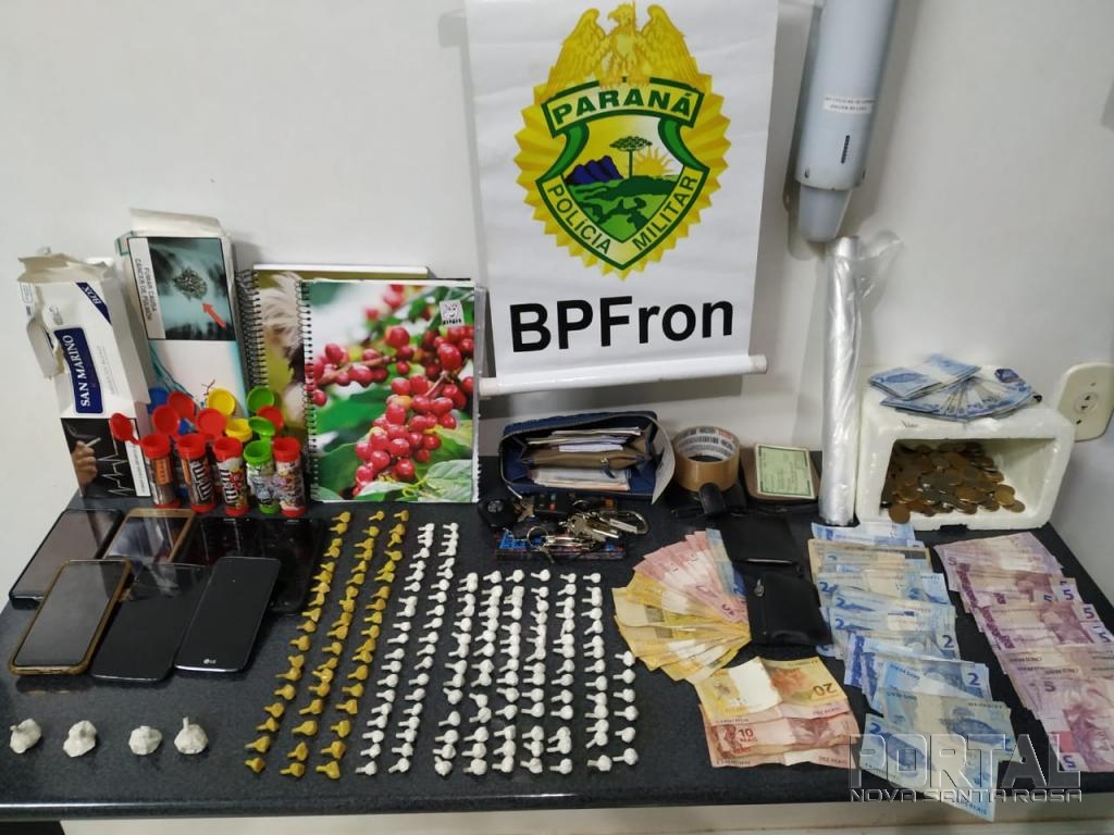Foram apreendidos também R$ 4.393,25 em espécie além de sete aparelhos celulares. Diante dos fatos foi solicitado apoio da equipe R.O.C.A.M./19°BPM, os quais auxiliaram na segurança, buscas e encaminhamento dos envolvidos, dos veículos, do dinheiro e das drogas às providencias de polícia judiciária.
