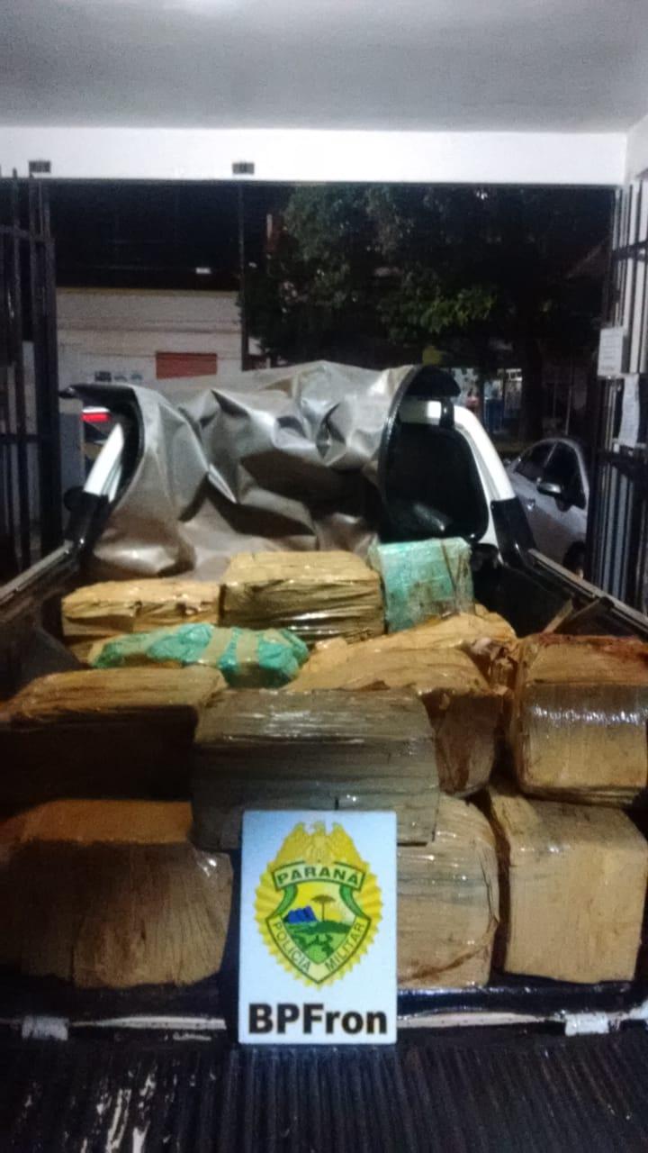 No ato de verificação do terreno foi localizado grande quantidade droga do tipo maconha 696,860 Kg na caçamba dispostos em 45 blocos de grandes proporções de uma Fiat/Strada de cor branca que possui alerta de furto.