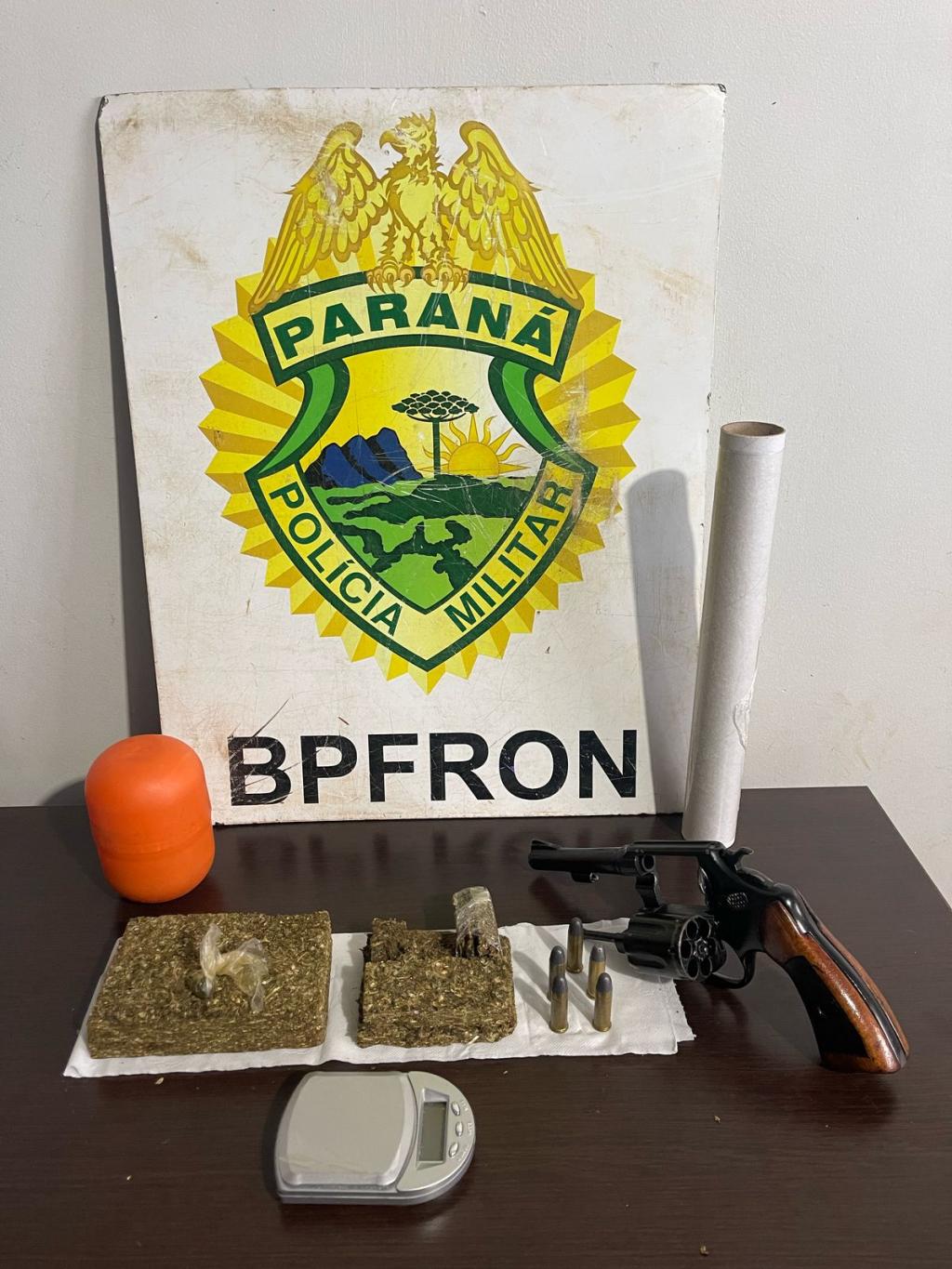 Durante as diligências, os policiais localizaram um revólver Taurus calibre .38, cinco munições, 332 gramas de substância análoga à maconha, 1,4 gramas de substância análoga ao haxixe, além de uma balança de precisão e um rolo de plástico filme.