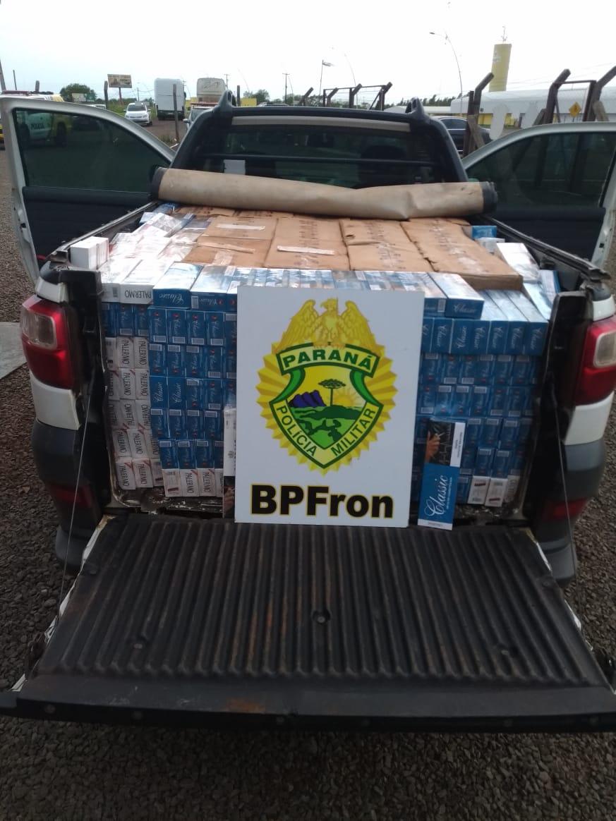 No Fiat Strada foram encontrados cerca de 1.000 pacotes de cigarros contrabandeados do Paraguai.
