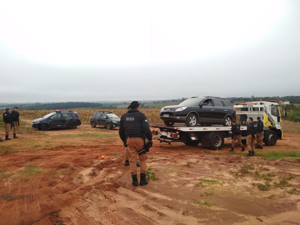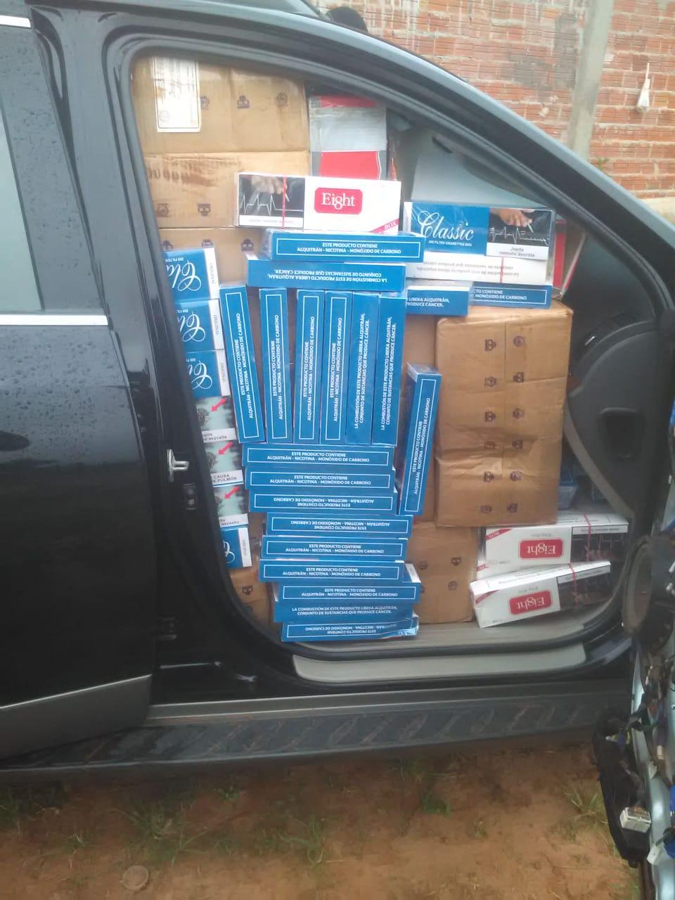 O condutor não acatou a ordem e empreendeu fuga adentrando em uma área rural, posteriormente abandonado o veículo e se evadindo, não sendo localizado. No veículo foram localizados 1 rádio transceptor, 1 caixa de essência de narguilé e cerca de 30 caixas de cigarros contrabandeados do Paraguai.
