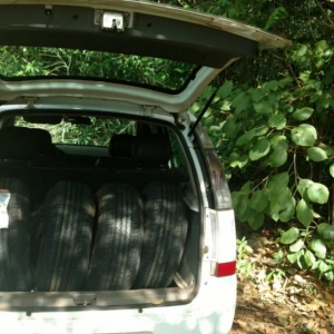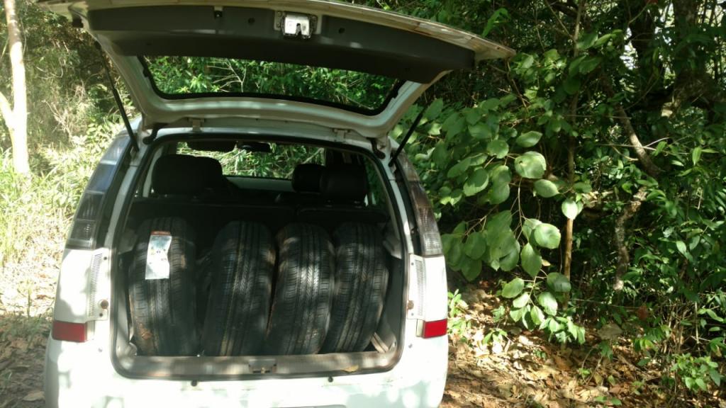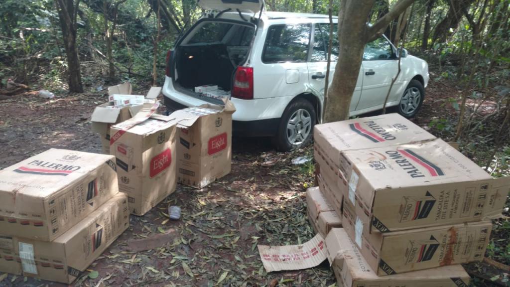 Em continuidade ao patrulhamento foram localizados dois veículos ao abandono, um Meriva e uma Parati, ambos de cor branca e sem queixa de furto ou roubo. Na Meriva foram localizados 66 pneus oriundos do Paraguai. Já na Parati foram encontrados 30 caixas de cigarros totalizando 1500 pacotes de cigarros contrabandeados do país vizinho.