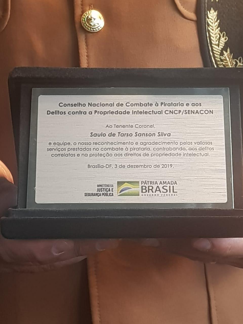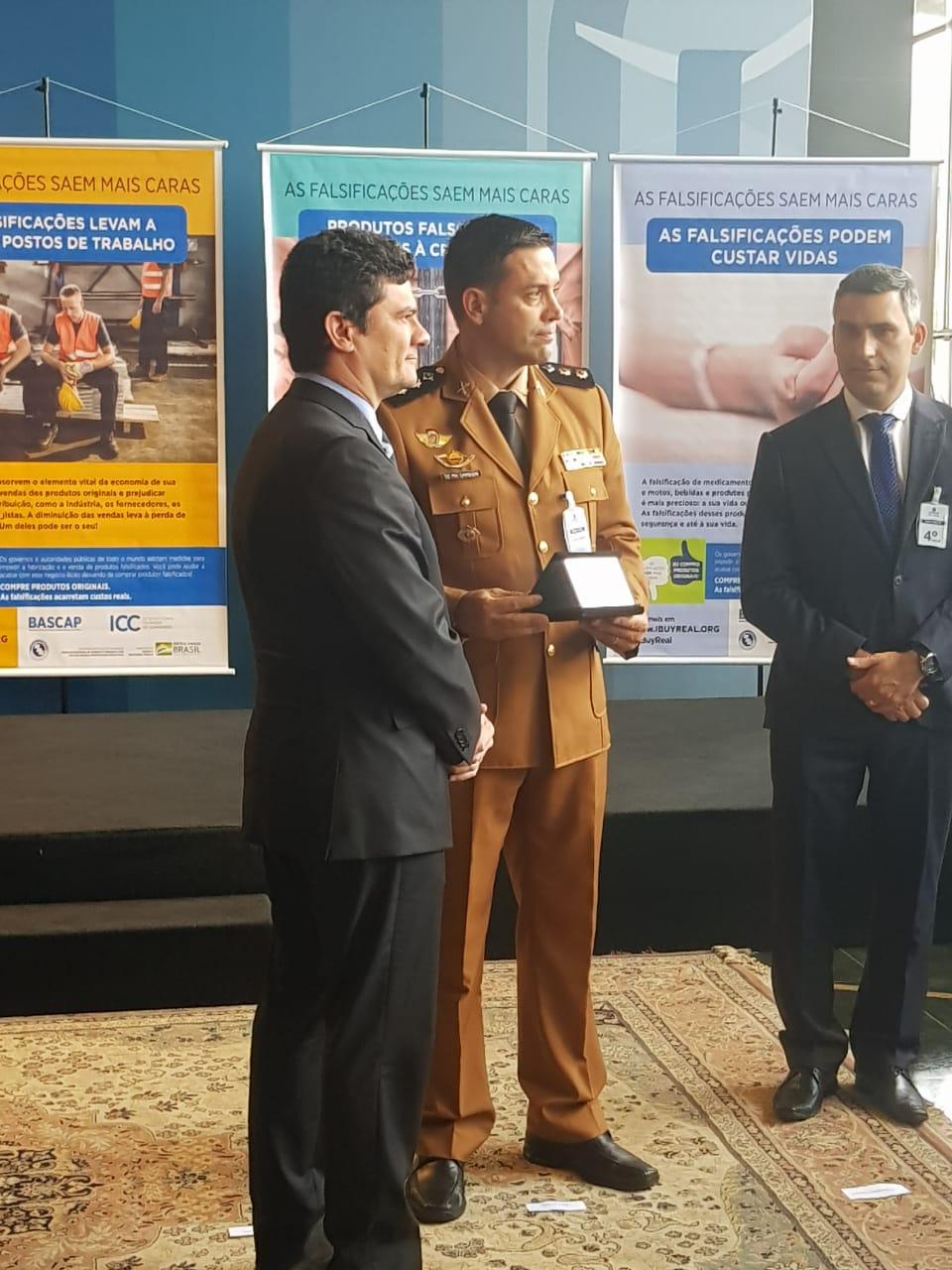 O comandante do BPFRON, Tenente-Coronel Sanson recebeu das mãos do Ministro da Justiça e Segurança Pública Sérgio Moro uma homenagem em referência aos Destaques do Ano de 2019 no Combate à Pirataria e os Delitos Correlatos.