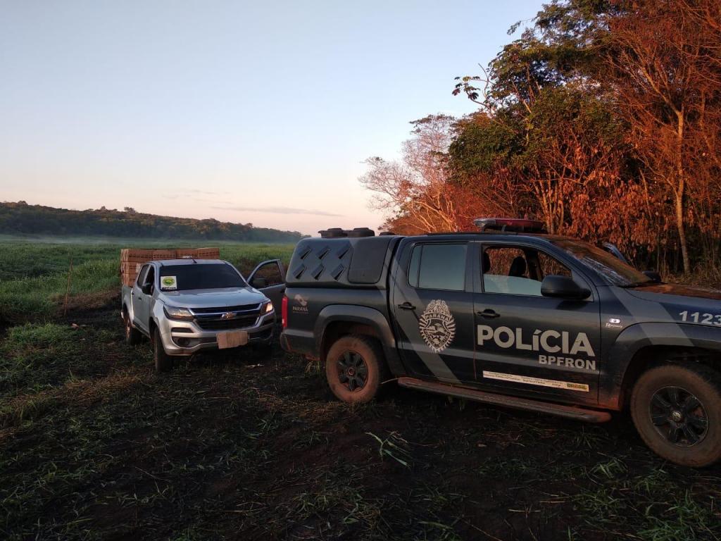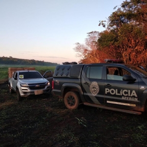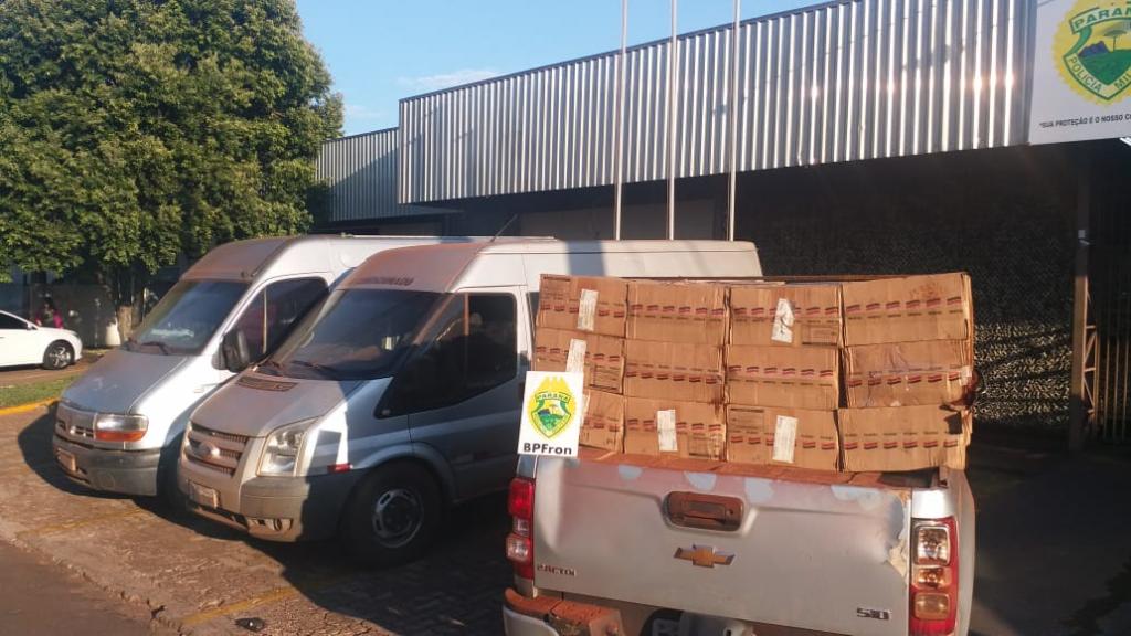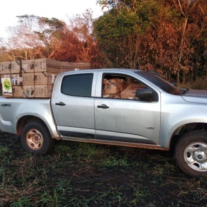 Diante disto os Policiais Militares adentraram a mata, para realizar buscas, e nessa diligência localizaram dois veículos tipo vans, sendo que ambos os estavam carregados com aproximadamente 200 caixas de cigarros ; continuando as buscas naquele local, próximo a barranca do Rio, foi localizado um veículo Chevrolet, S10 também carregado com aproximadamente mais 50 caixas de cigarros e 01 volume de agrotóxicos ; que após consulta do chassi da GM S10 foi constatado que era produto de furto no estado de São Paulo, conforme boletim de ocorrência daquele Estado.