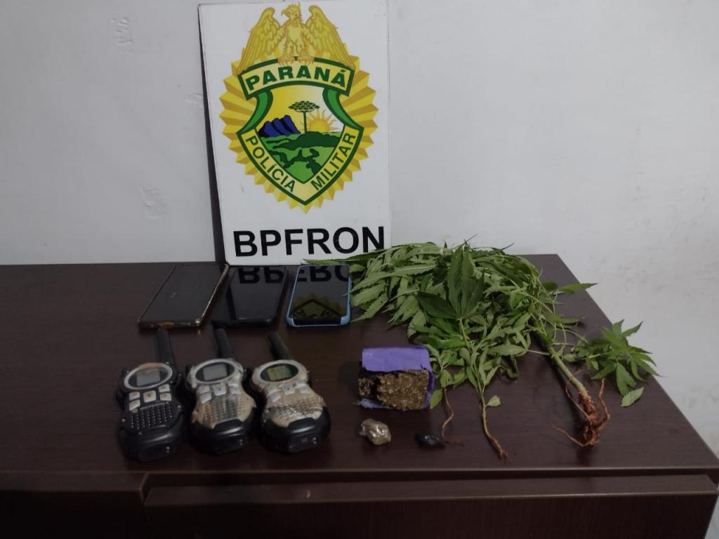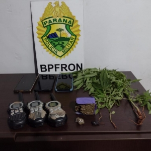 No local ainda foram apreendidos um veículo com registro de furto em Cascavel no dia 09 de fevereiro, três rádio comunicadores, 65 gramas de substância análoga a maconha, três pés de Cannabis sativa, três aparelhos celulares além de uma grama de cocaína.