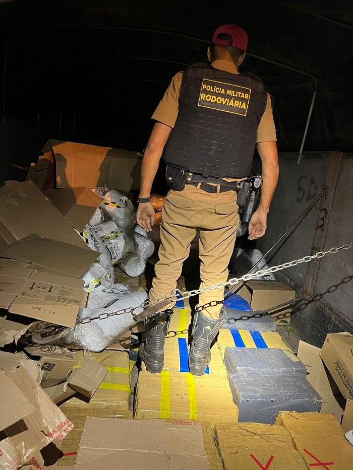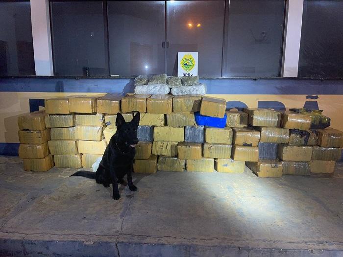 O cão Black, integrante da equipe, indicou a presença de algo ilícito na carroceria do veículo. Ao realizar a busca, os policiais encontraram 55 fardos de substância análoga a maconha prensada, totalizando 1.259,15 kg, além de 3 volumes de maconha do tipo skank, que pesaram 6.550,00 kg.