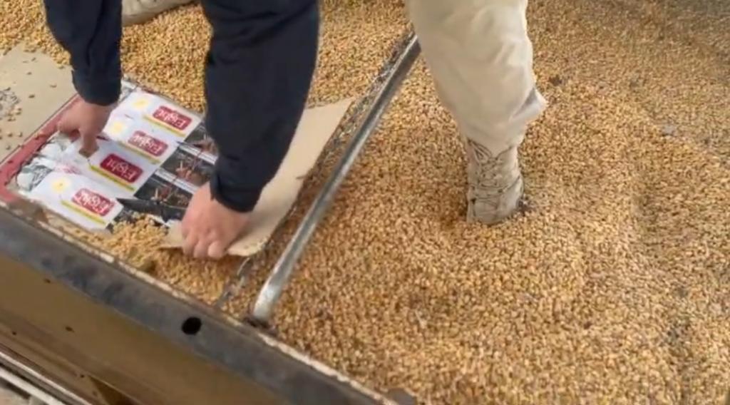 Após vistoria, os agentes constataram que sob uma fina camada de milho havia um carregamento de aproximadamente 500 mil maços de cigarros de origem estrangeira, configurando crime de contrabando. Além disso, foi identificada a adulteração de placa em um dos semirreboques.
