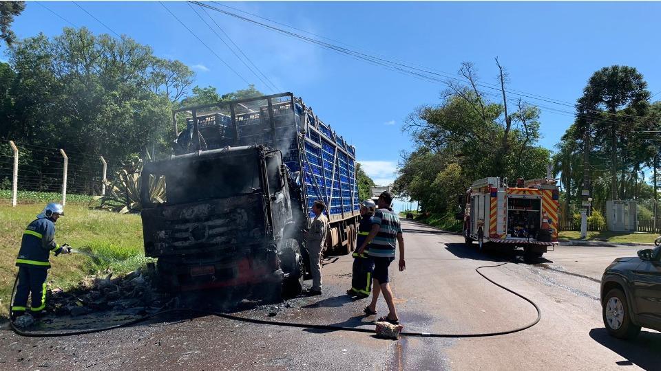 Cabine de caminhão ficou destruída após incêndio na PR 180 região do bairro Interlagos em Cascavel, em frente ao condomínio Pantanal, na manhã de quarta-feira (30).