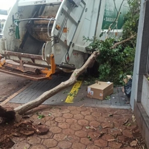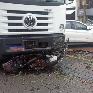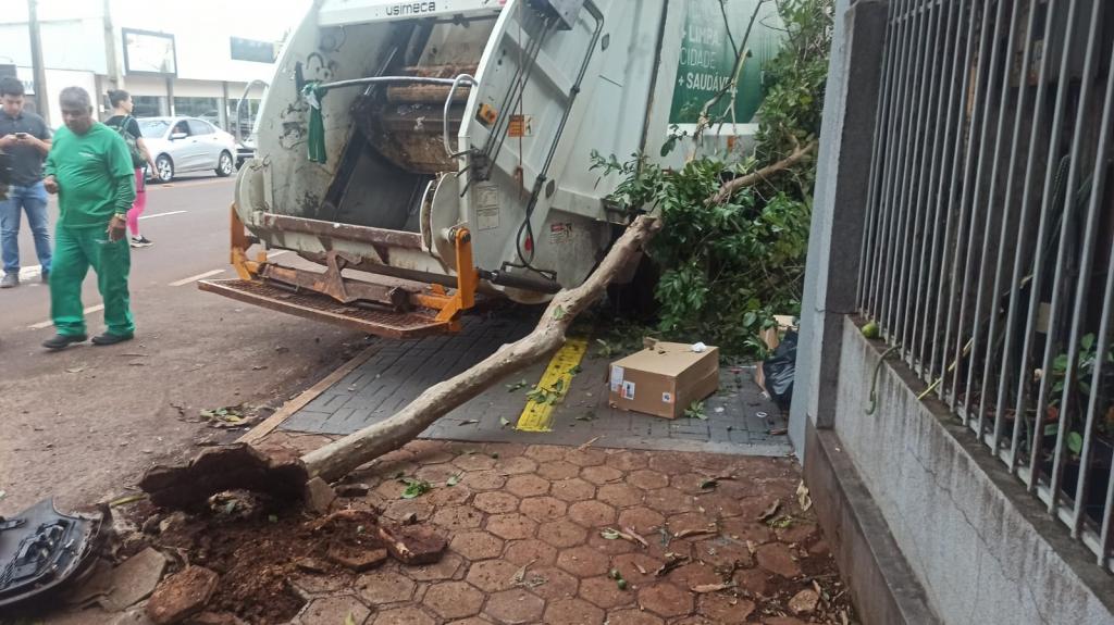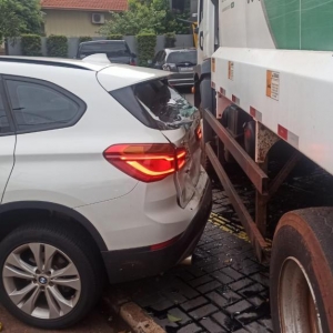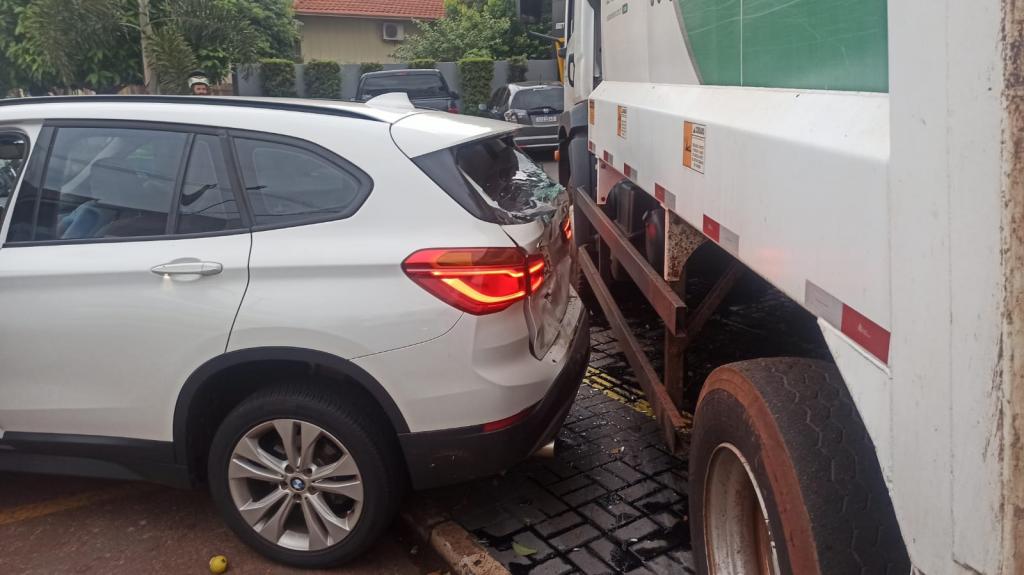 Um caminhão Volkswagen que presta serviços de coleta de lixo reciclável em Toledo colidiu com outros veículos que estavam estacionados na rua São João, centro da cidade.