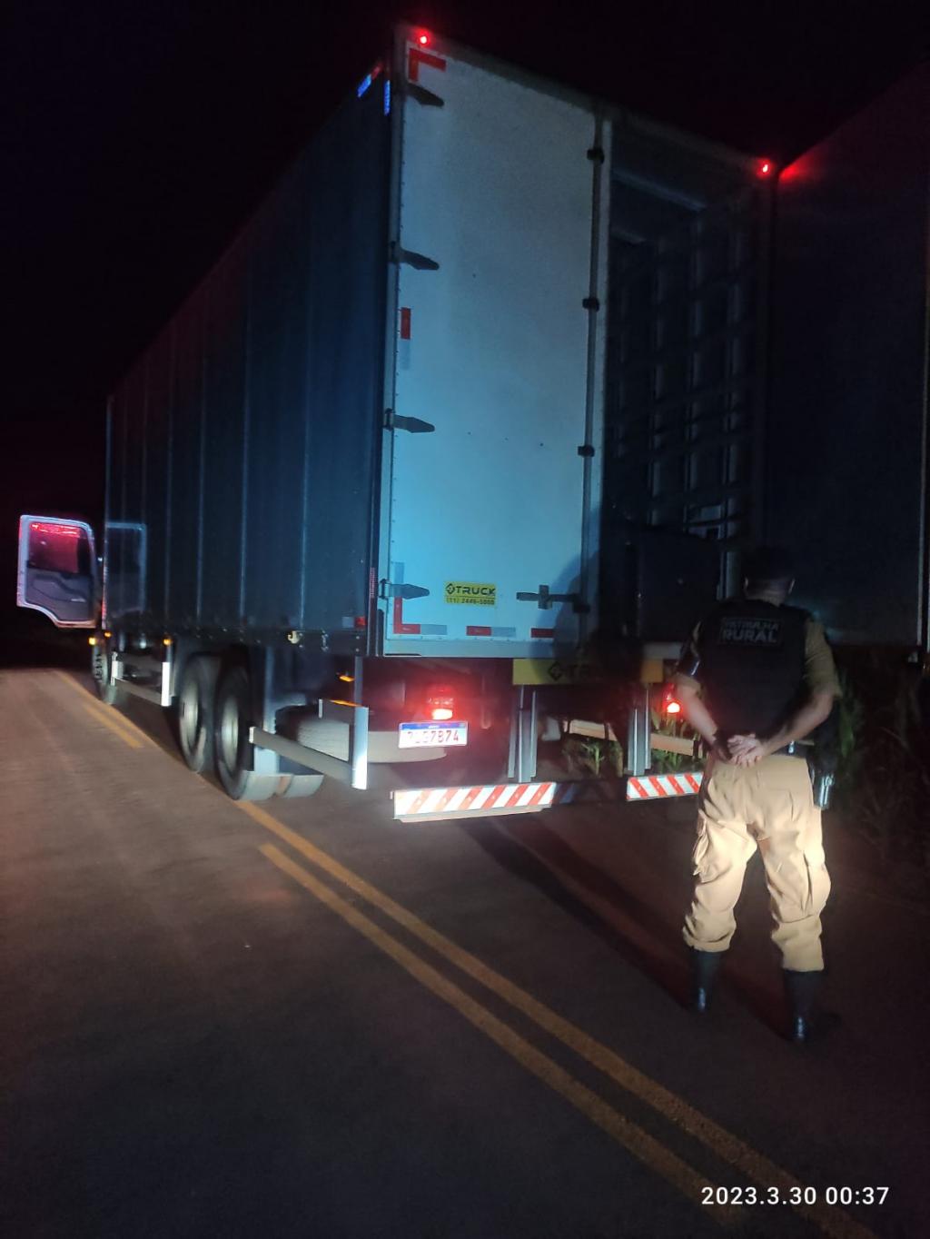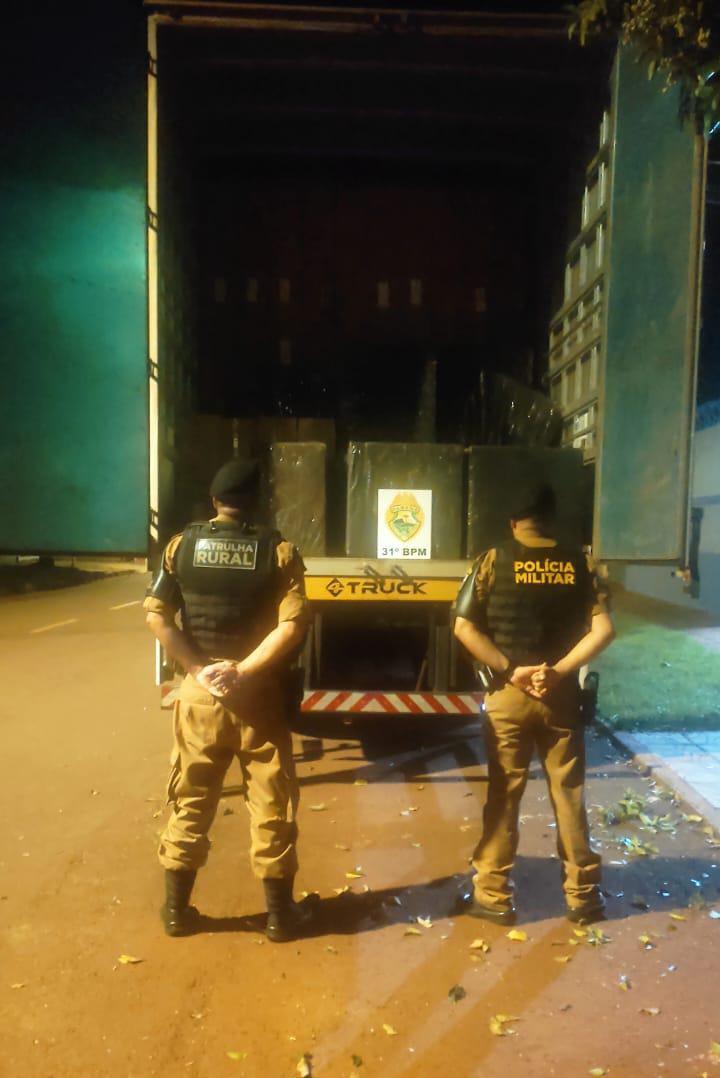 Foi na madrugada desta quinta-feira que a Polícia Militar em patrulhamento na linha São Roque, interior do município de Palotina avistou um caminhão baú que ao tentar abordar o condutor tentou fuga sendo alcançado e preso, o caminhão estava carregado com cerca de 500 caixas de cigarros, caminhão com placas adulteradas.