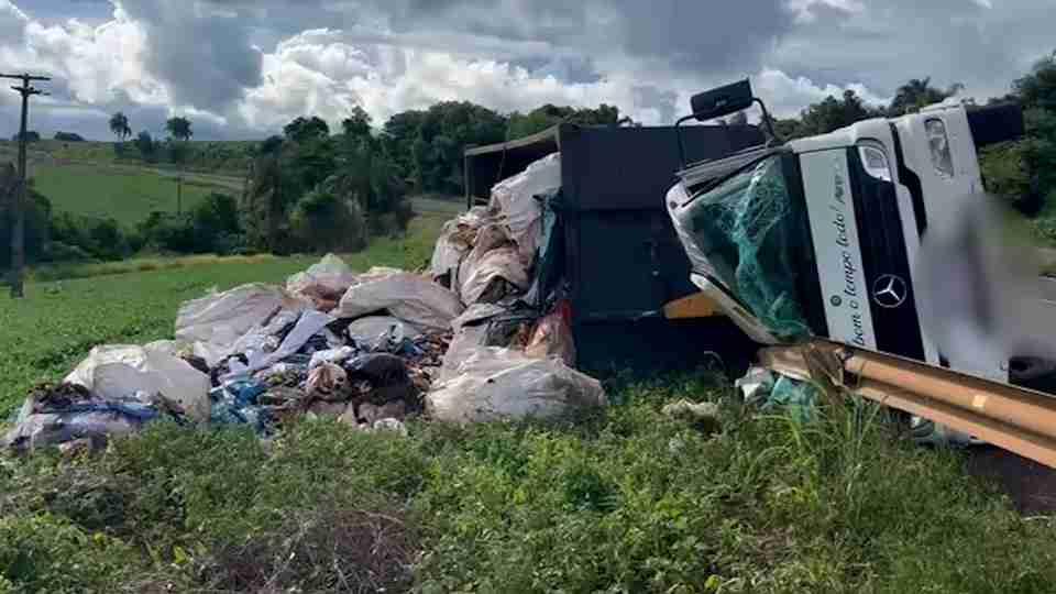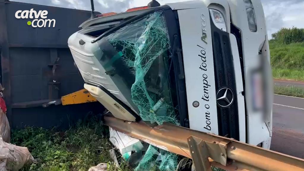 Um caminhão caçamba carregado com lixo reciclável tombou, ainda na terça-feira (23), na BR 163 em Cascavel.