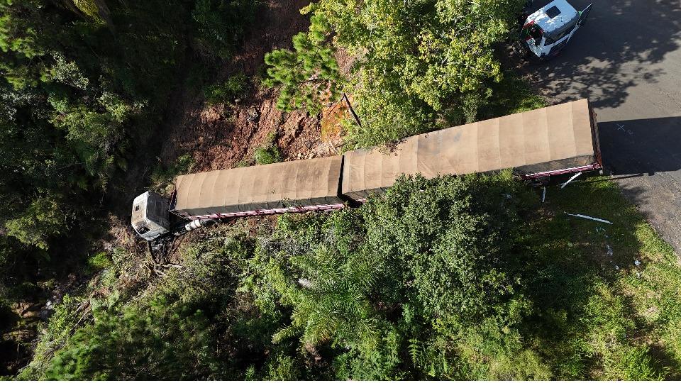 Um caminhão bitrem caiu na ribanceira do mirante na Serra da Esperança, BR 277, em Guarapuava, no Centro-Sul do Paraná, na manhã desta quinta-feira (20).